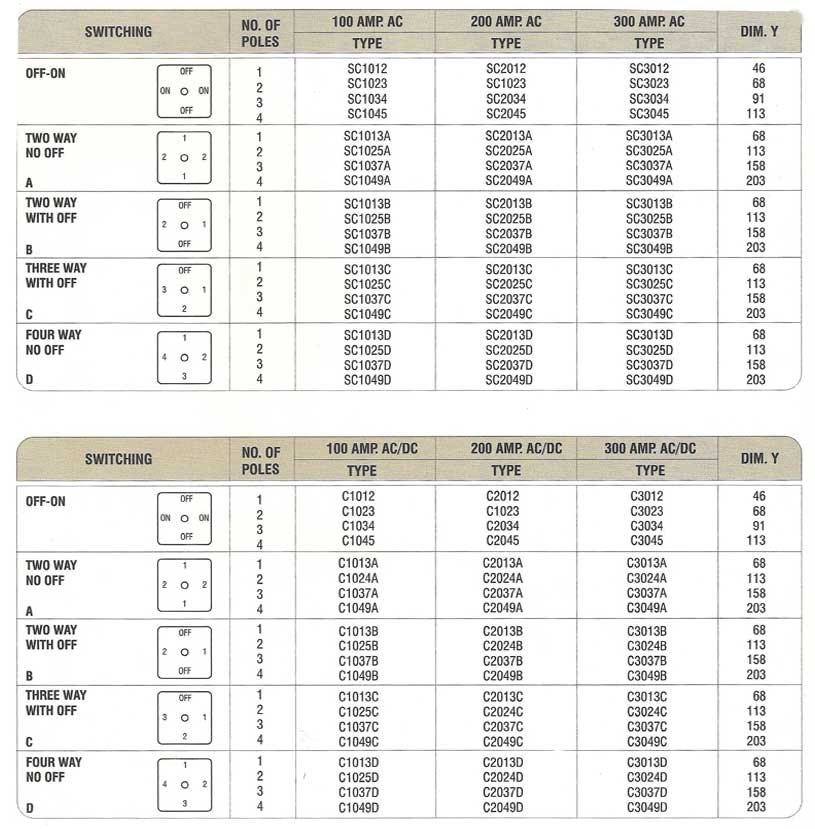 Rotary Swiches of 100-600 amperes, 4 Position, Listed overleaf, are with standard switching sequences up to 4 poles. Multi -pole switches are offered on request.